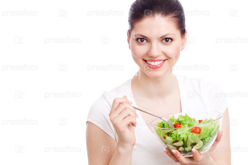 Молодая женщина ест полезный овощной салат. Белый фон