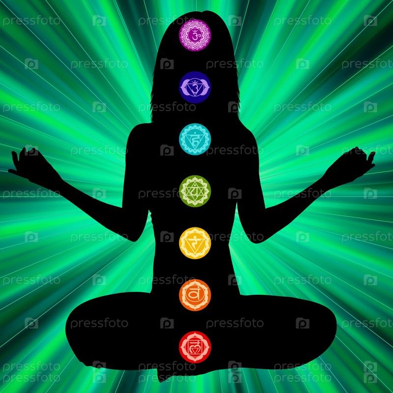 Черный силуэт женщины с семью чакрами на зеленом фоне