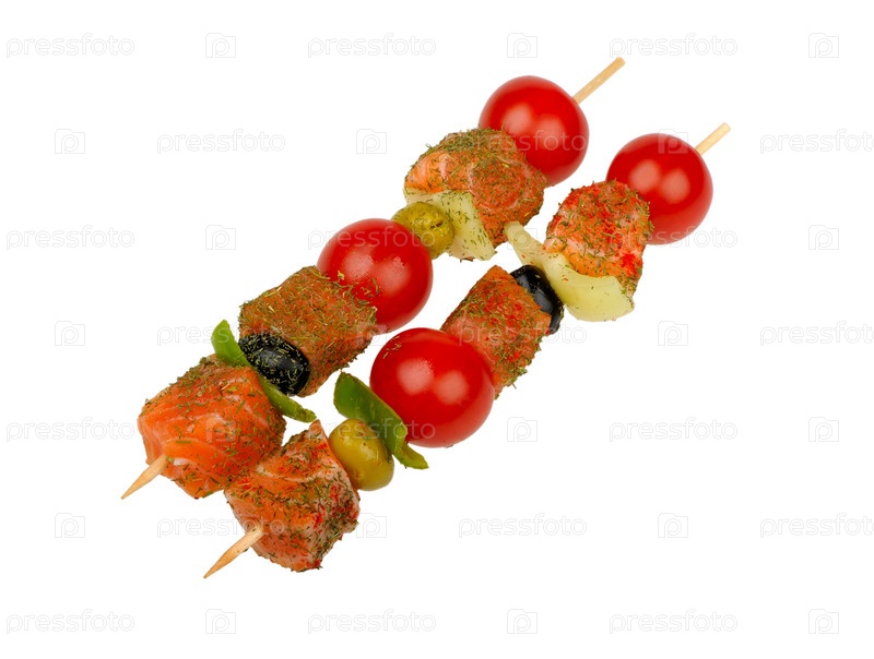 Шашлычки из сёмги и овощей на белом фоне