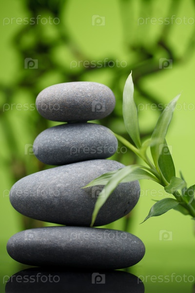 Камни для спа-процедур и бамбуковая веточка на зеленом фоне