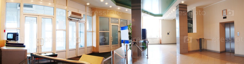 Панорамный снимок проходной с турникетами в офисном здании