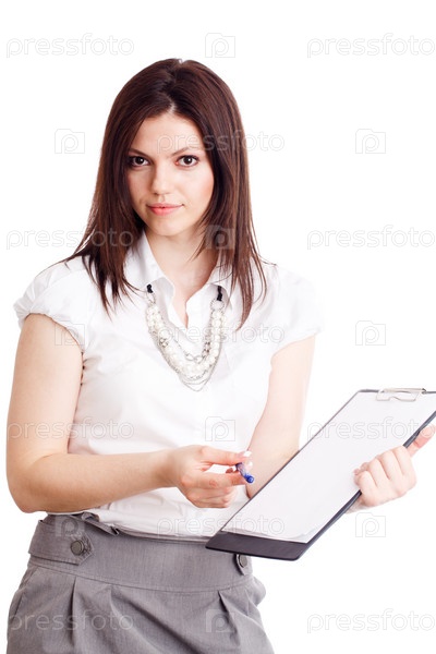 Симпатичная деловая женщина с пустым листом бумаги и ручкой