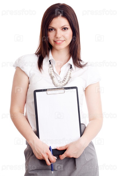 Симпатичная деловая женщина с пустым листом бумаги и ручкой