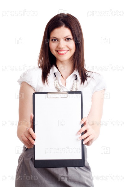 Симпатичная деловая женщина с пустым листом бумаги и ручкой