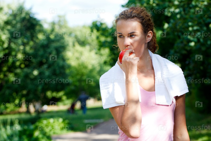 Молодая женщина ест яблоко в летнем парке после тренировки