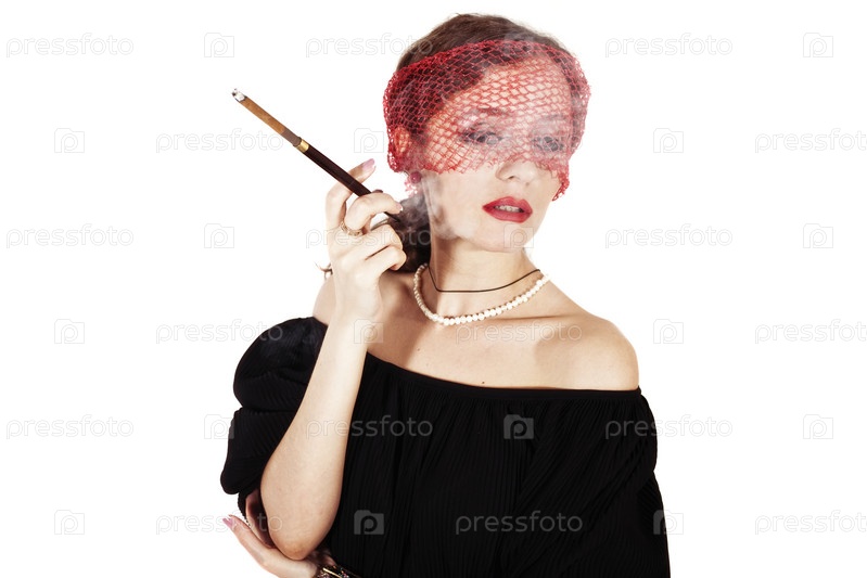 Женщина с сигаретой в мундштуке на белом фоне