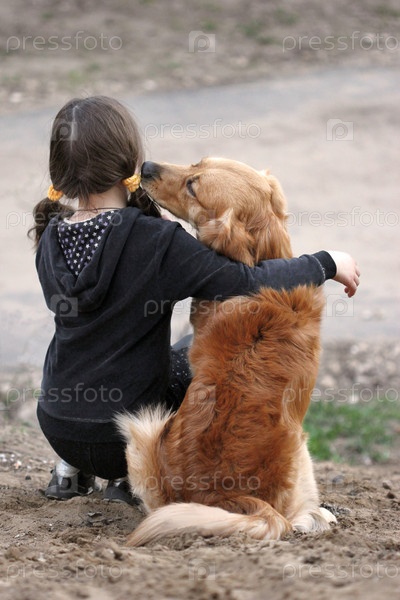 Девочка обнимает собаку на улице