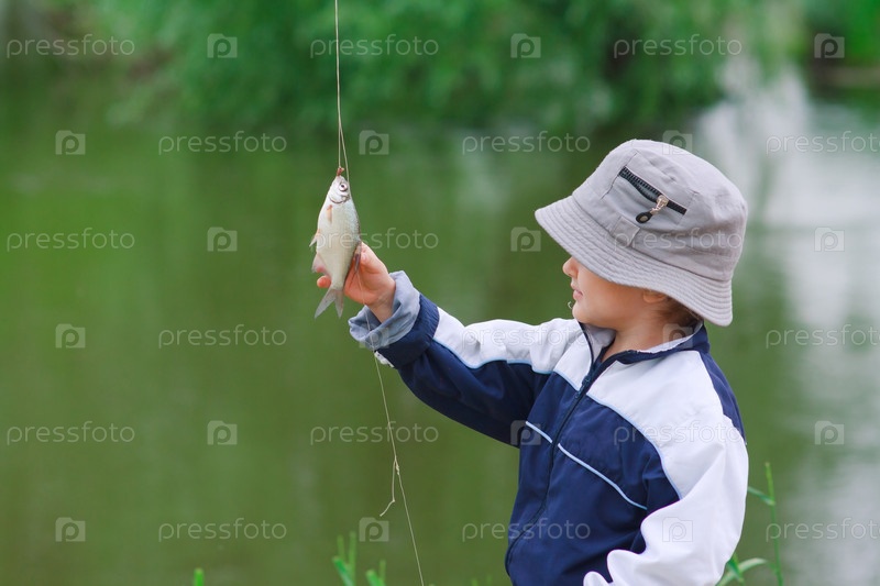 Маленький мальчик рассматривает пойманную рыбу