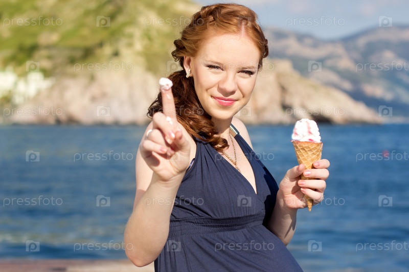 Молодая беременная женщина на пляже с мороженым