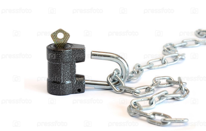 Висячий замок с ключом на белом фоне