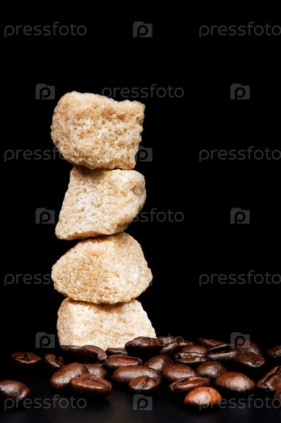 Куча кубиков сахарного тростника и кофейных зерен, изолированных на черном фоне