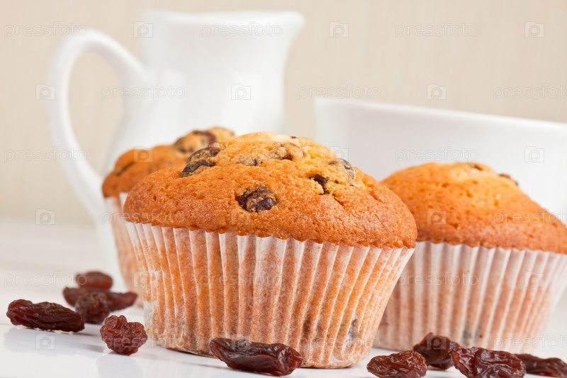 Кексики с изюмом, чашка и молочник на столе