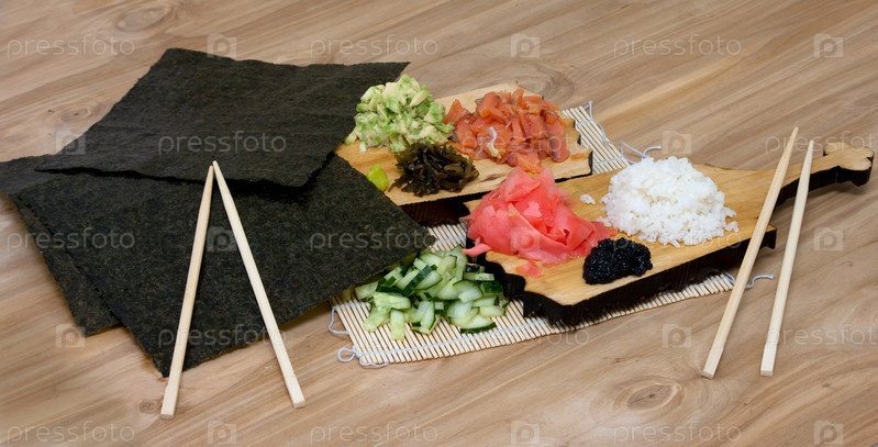 Продукты для приготовления суши на деревянном столе