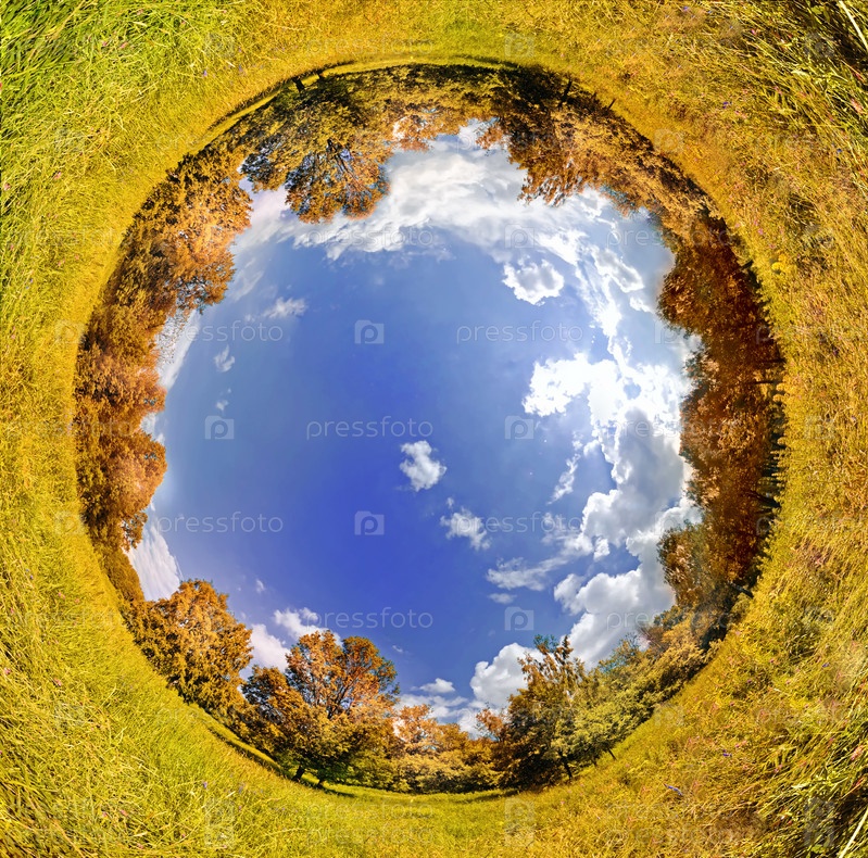 Панорамное изображение луга, которое выглядит как планета