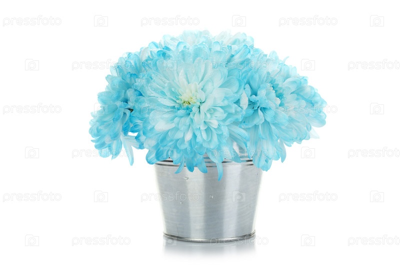 Голубые хризантемы в ведре на белом фоне