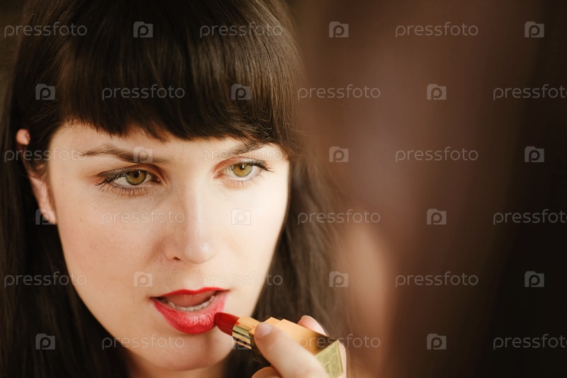 Молодая красивая девушка красит губы, смотря в зеркало