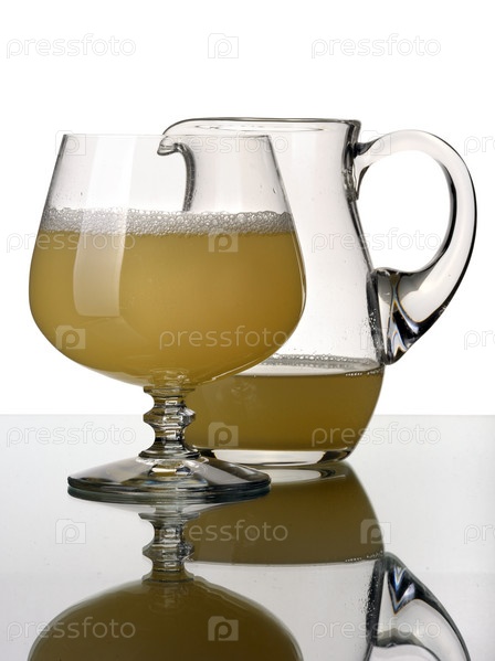 Стеклянный кувшин и бокал с желтым напитком на белом фоне