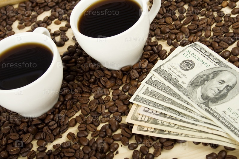 Две чашки черного кофе и пачка долларов на рассыпанных кофейных зернах