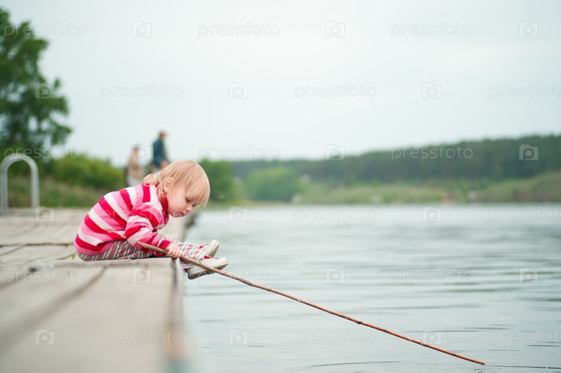 Маленькая девочка на пирсе с удочкой в руках