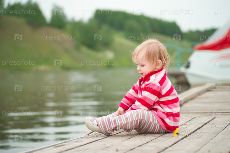 Маленькая девочка на пирсе с удочкой в руках