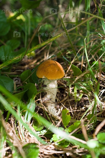 Гриб с красной шляпой, сияющий под солнцем в траве