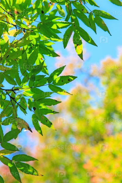 Зеленые листья дерева на фоне голубого неба