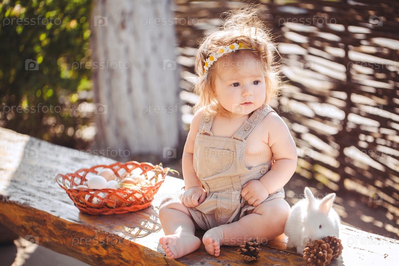 Маленькая девочка играет с белым кроликом