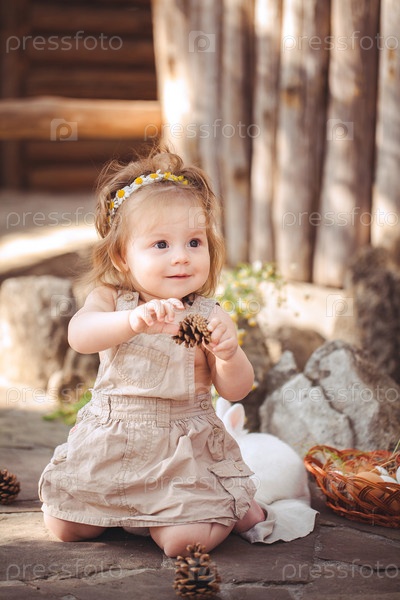 Маленькая девочка играет с белым кроликом