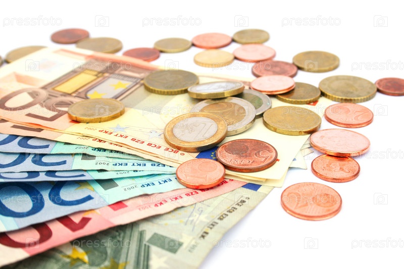 Монеты и банкноты евро на белом фоне