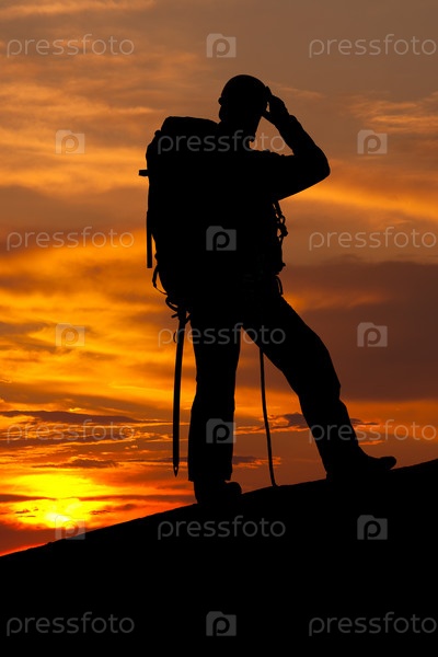 Силуэт альпиниста на фоне заката