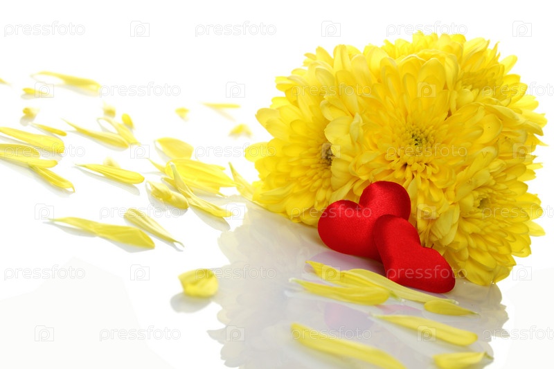 Желтые хризантемы с двумя красными сердцами. Изолированы на белом фоне