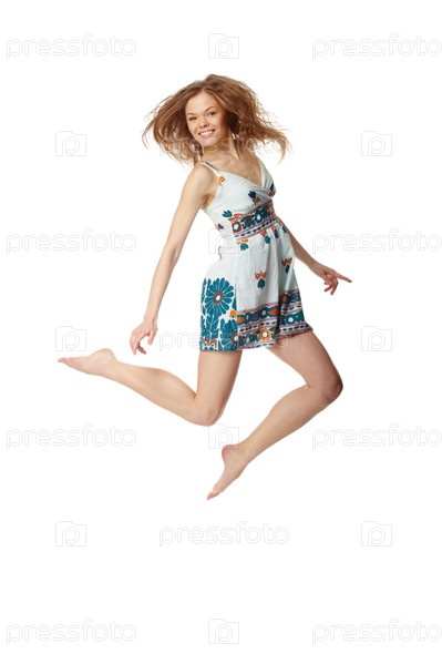 Девушка в прыжке на белом фоне