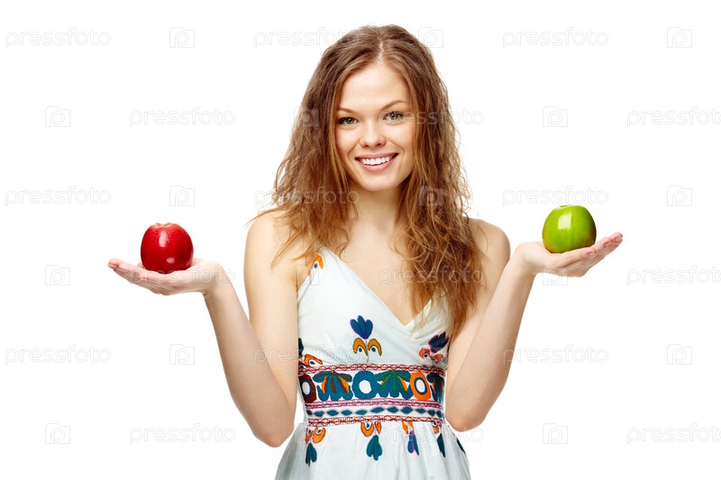 Молодая девушка с яблоками в руках на белом фоне