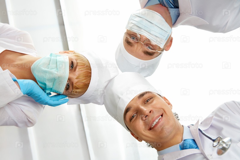Три медицинских работника смотрят на камеру