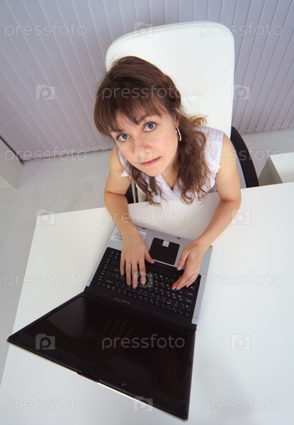 Забавная женщина сидит за столом с компьютером - вид сверху