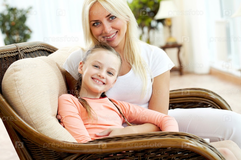 Мать и дочка сидят на диване