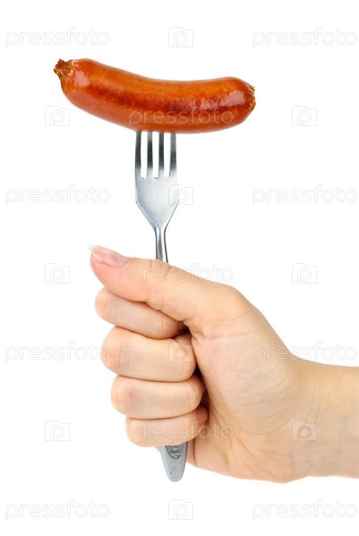 Рука держит наколотую на вилку поджаренную сосиску, на белом фоне