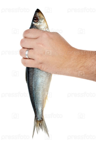 Селедка в руке на белом фоне