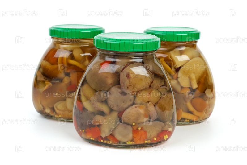 Стеклянные банки с маринованными грибами на белом фоне