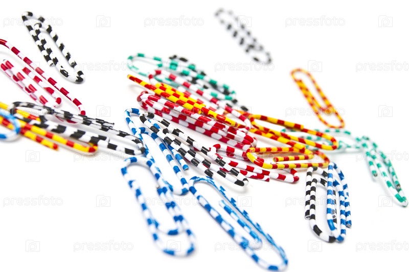 Разноцветные скрепки на белом фоне