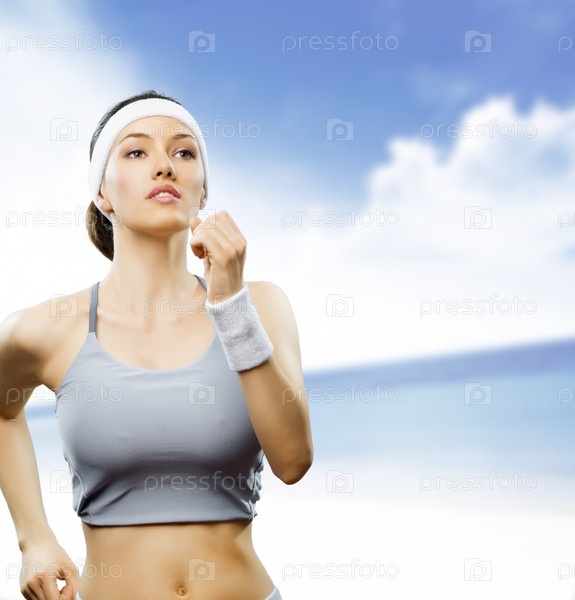 Спортивная девушка бежит вдоль берега