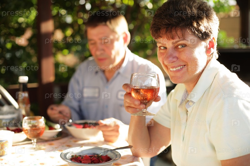 Муж с женой ужинают на открытом воздухе