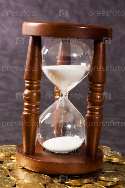 Старые песочные часы и монеты на сером фоне. Время - деньги