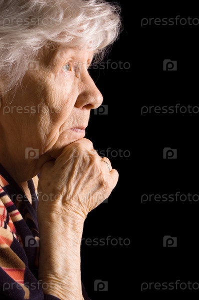 Портрет пожилой задумчивой женщины на черном фоне