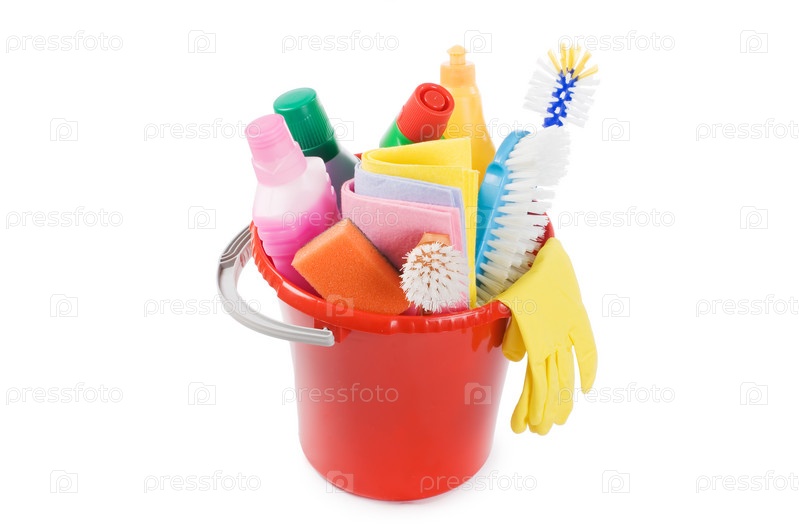 Ассортимент средств для уборки на белом фоне