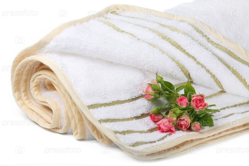 Махровое полотенце с небольшим букетом из роз на белом фоне
