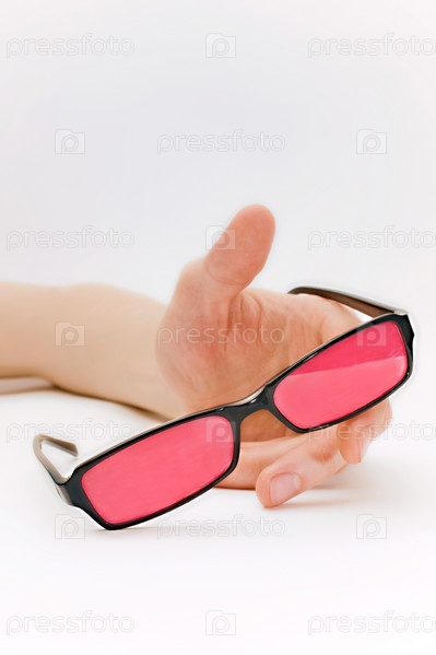 Очки с розовыми стеклами в руке, белый фон