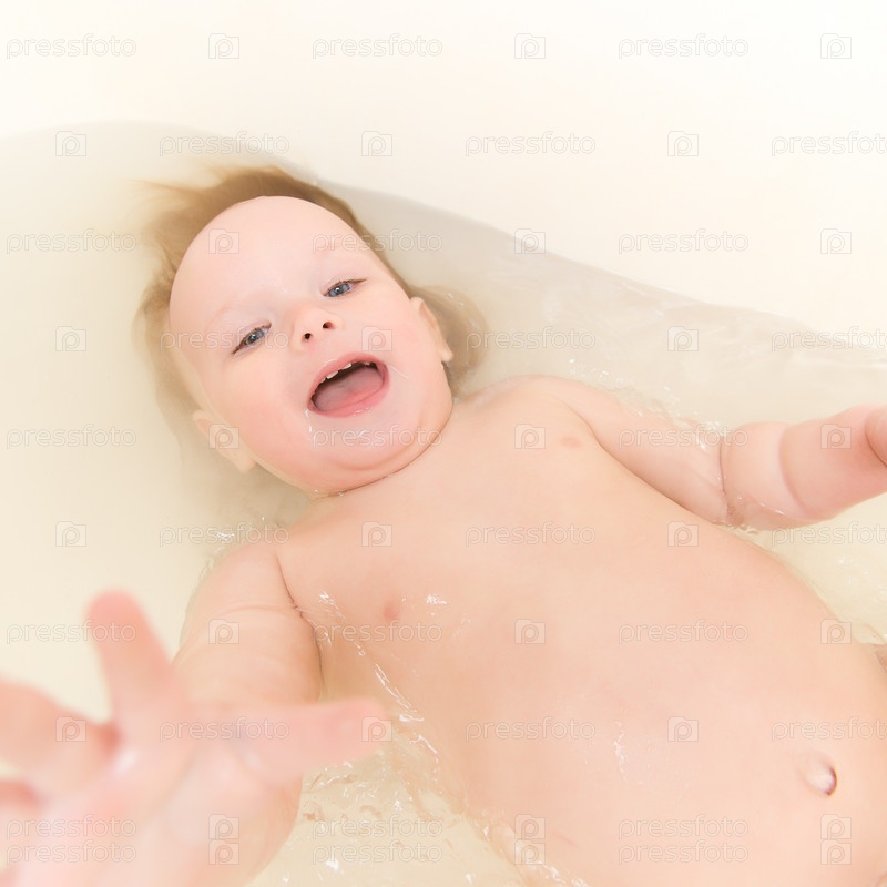 Очаровательный ребенок принимает ванну и лежит на спине
