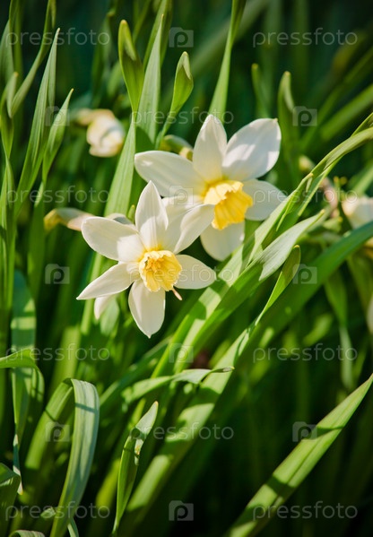 Цветущие нарциссы в траве, крупный план