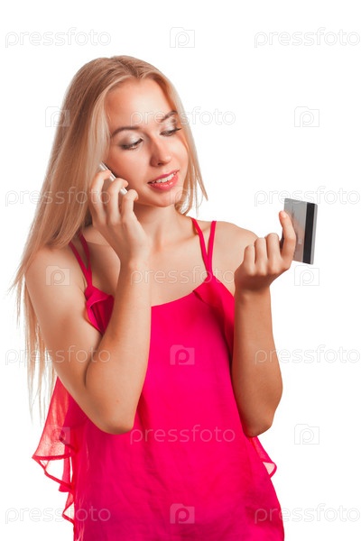 Молодая женщина говорит по телефону с кредитной картой в руке